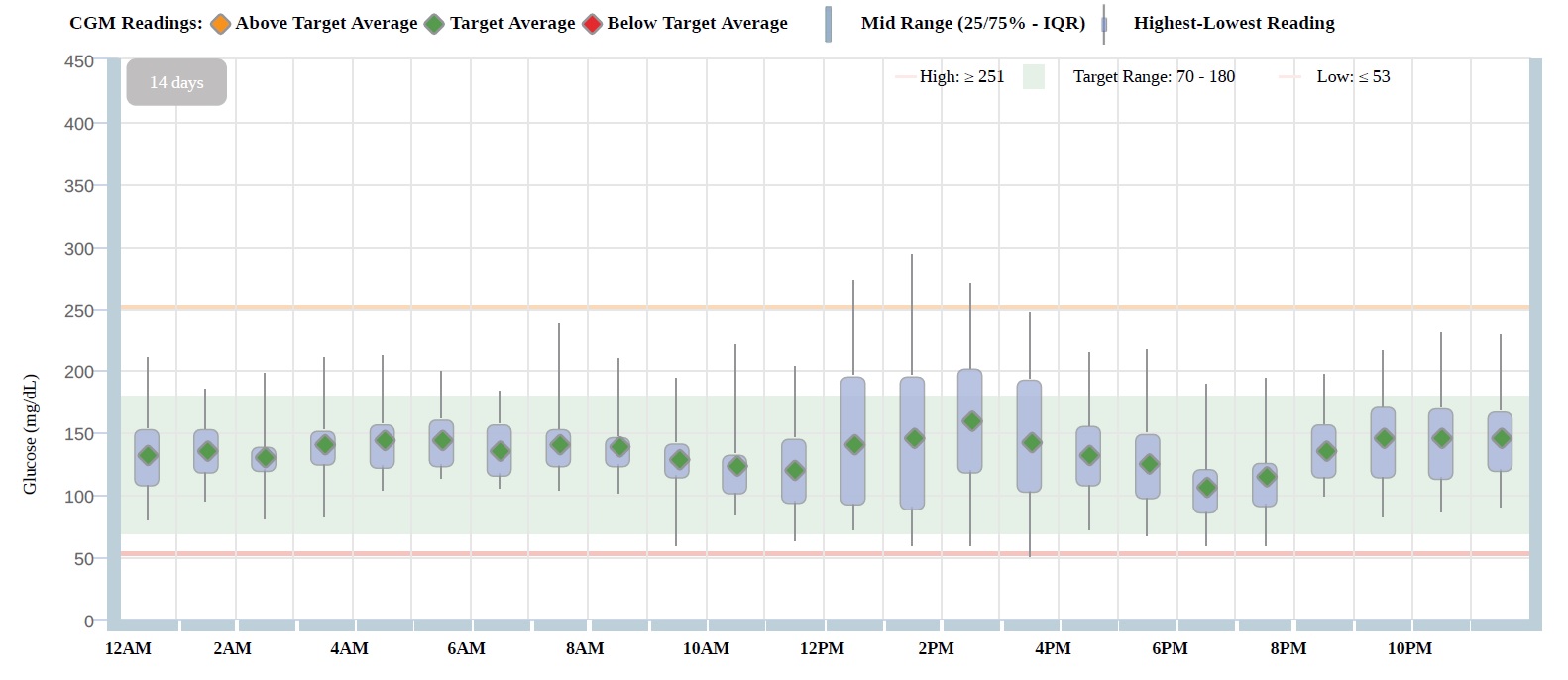 Results: At 4-years post-ITx, fasting glucose was 110 mg/dL, fasting C-peptide 0.72 mg/dL and MMTT peak C-peptide 2.53 ng/mL, with insulin TDD 0.08 units/Kg/day, HbA1c 6.4%, and BETA-2 score 12 (Table 1). At 6-years post-ITx, CGM 14 days data review shows: GMI 6.6%, time in target range (70-180 mg/dL) 86%, time below range (<70 mg/dL) 1%, time below range (<54 mg/dL) 0%, and CV 28%, with insulin TDD of 0.14 unit/Kg/day. Summary of CGM summary of values over a 14-days period is shown on Figure-1.