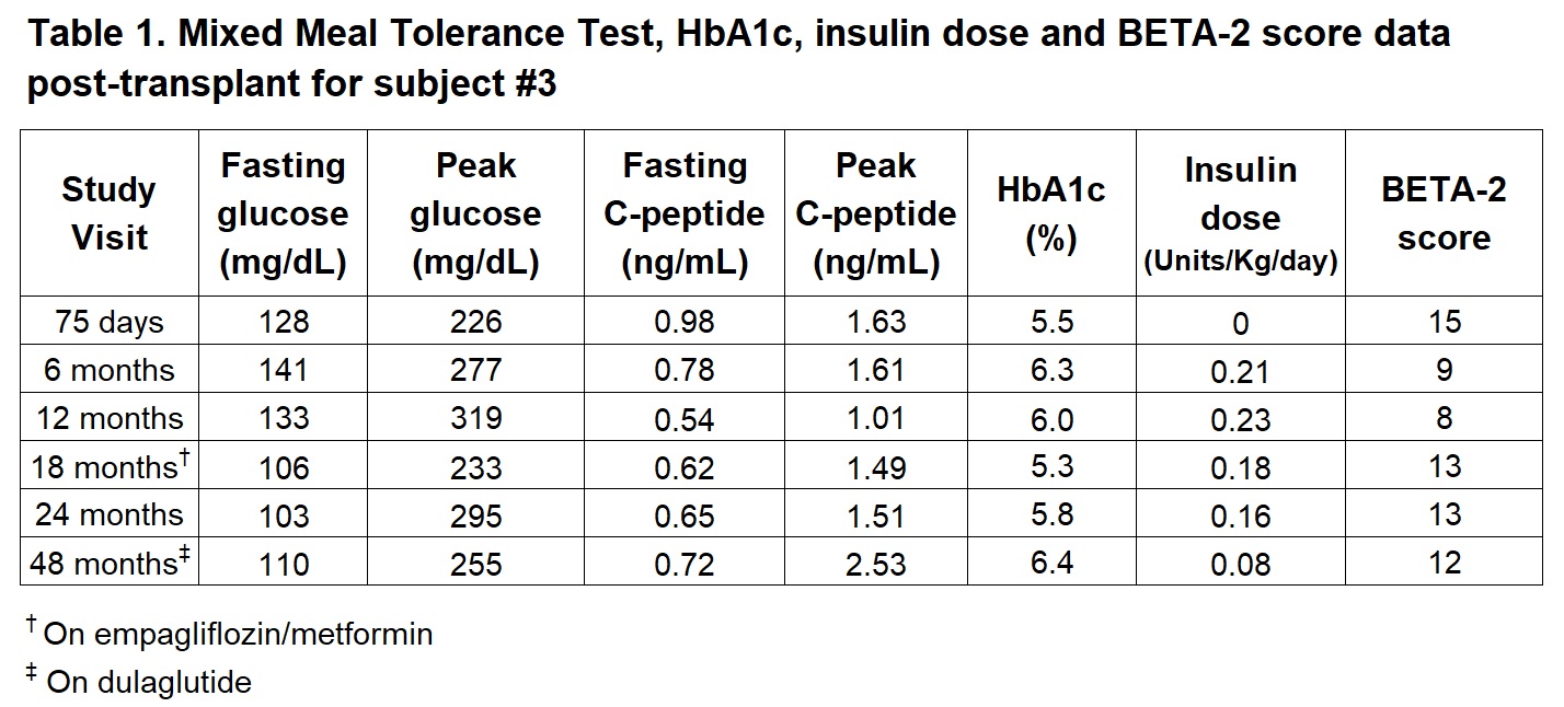 Methods: A 46 y/o woman with T1D of 26 years duration underwent single ITx on the omentum (12,648 IEQ/Kg) using a biologic scaffold under ATG induction and mycophenolate sodium + tacrolimus maintenance immunosuppression (IS). Exenatide extended-release (Bydureon®) 2 mg subcutaneously once weekly was started on post-operative day -2 but discontinued after 4 doses due to side effects. At 46-months, maintenance IS was changed to azathioprine and tacrolimus XR (Envarsus XR®). Pre-ITx insulin total daily dose (TDD) was 0.45 units/Kg/day and HbA1c 6.3%. Mixed meal tolerance test (MMTT), HbA1c and insulin requirements were obtained at follow-up visits up to 4 years post-ITx. Continuous glucose monitoring (CGM) metrics and insulin requirements were obtained at 6 years post-ITx. To improve and maintain adequate glycemic control, combination empagliflozin/metformin was added after the 12-month visit and stopped 8-months later due to associated side effects. Dulaglutide (Trulicity®) 0.75 mg SC weekly was introduced at 42-months post-transplant with good tolerability.