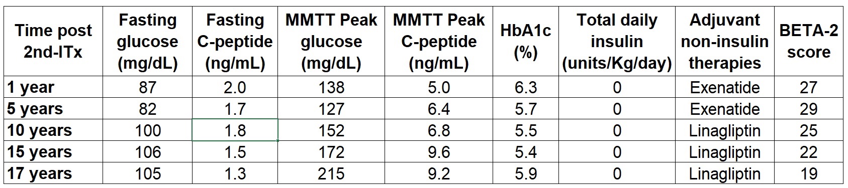 Results: Insulin independence was achieved 1-week post-1st ITx and was maintained for 23 months. To improve metabolic control, treatment with short-acting exenatide was started at 35 months. A 2nd ITx was given 40 months post-1st ITx. Prior to 2nd ITx, MMTT stimulated C-peptide was 3.8 ng/mL, insulin TDD 0.13 units/Kg/day, and HbA1c 6.6% (while on short-acting exenatide). The patient became insulin independent 9.5 months post-2nd ITx. At 5-yrs post-2nd ITx, exenatide was switched to liraglutide, and ultimately switched to linagliptin at 6.4-yrs. At 17-yrs post-2nd ITx, patient remains insulin independent with fasting glucose 105 mg/dL, MMTT stimulated C-peptide 9.16 ng/mL, HbA1c 5.9%, and BETA-2 score 19. CGM 14-days data review shows: time in range (70-180 mg/dL) 98%, time in range (70-140 mg/dL) 84%, time below range (<70 mg/dL) 0%, and CV 16.5%. MMTT data post-2nd ITx and CGM ambulatory glucose profile are shown in Table 1 and Figure 1.