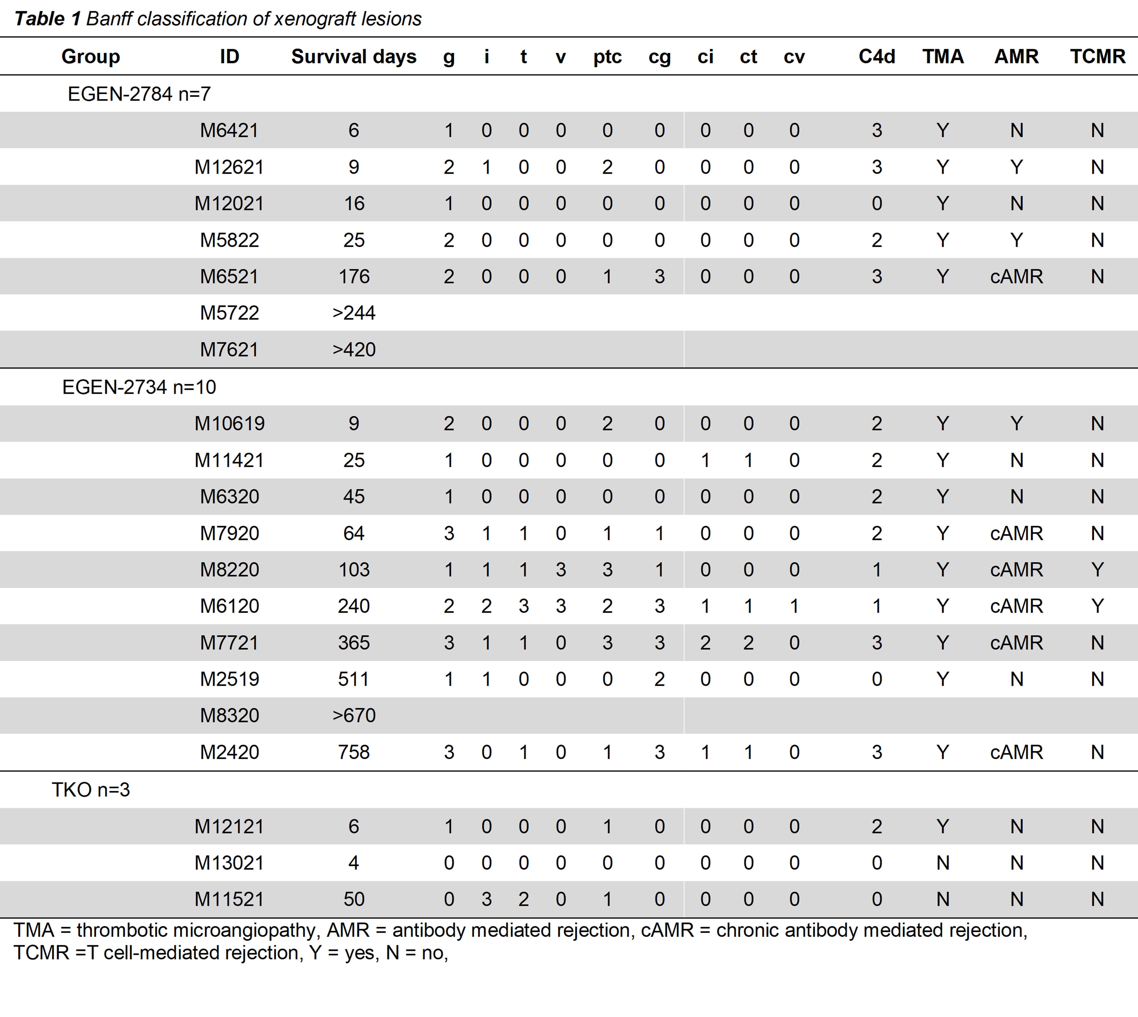 Results: Recipient survival was significantly increased using donor organs expressing human transgenes compared to 3KO only grafts (median, 103 vs. 6 days, p=0.001, Log-rank) (Figure 1). Pre-transplant anti-porcine titers showed no correlation to survival, long-term animals, including >2 year surviving animal showed high comparative pre-transplant IgM binding. The major cause of the early (<60 days) graft loss was thrombotic microangiopathy (TMA). Biopsies from three recipients currently in progress on >244, >420 and >670 days showed no rejection or TMA. Four other long-term (>240 days) survivors also showed no rejection/TMA until close to the graft loss which was due to rapidly developed antibody-mediated rejection (AMR) and TMA. In contrast to allotransplantation, in which T cell-mediated rejection (TCMR) is the major pathology, TCMR was observed in only two EGEN-2734 recipients after reduction of anti-CD154 mAb dose (Table 1).