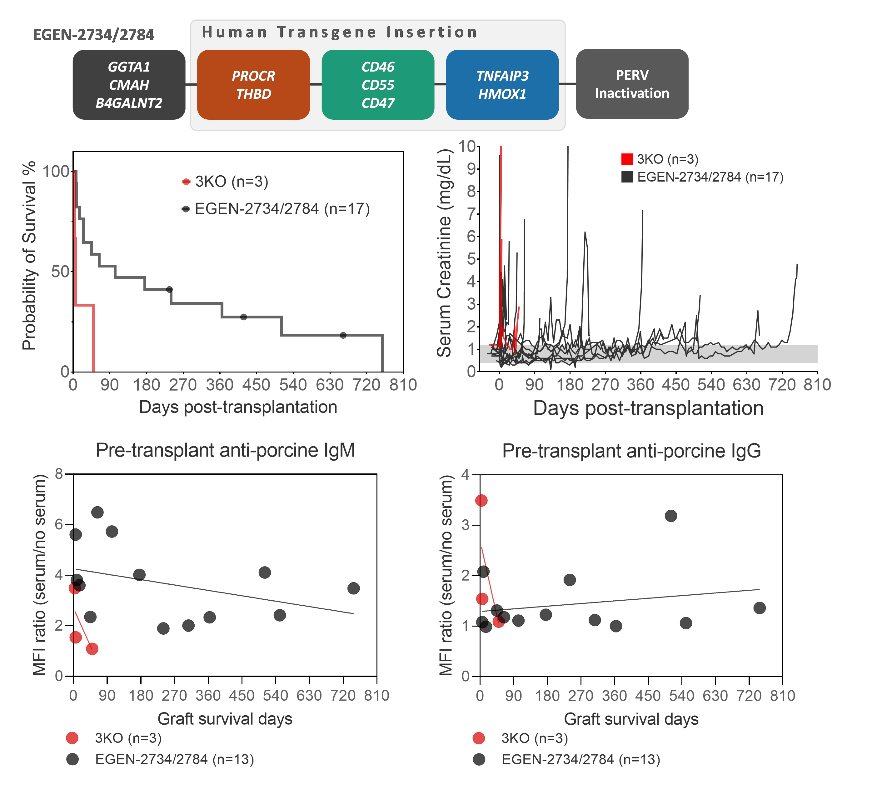 Methods: 3KO donors (n=3), and 3KO donors also expressing selected human transgenes that control complement (CD46 and CD55), coagulation (THBD and PROCR), innate immunity (CD47), and inflammation (TNFAIP3, and HMOX1) were produced by eGenesis (EGEN-2734, n=10; EGEN-2784, n=7) on a Yucatan miniature swine background.