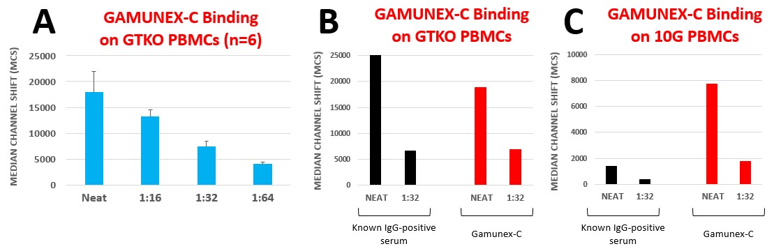 Results: As expected, Gamunex-C expresses anti-pig IgG antibodies and reacts to genetically-modified pig lymphocytes even in the absence of the 3 most common xenoantigens. When tested against 6 different GTKO pigs, no significant differences between animals were found (Fig 1A). When compared to a serum known to have strong IgG reactivity against GTKO lymphocytes, Gamunex-C performed similarly (Fig 1B). However, distinct from the control serum, when the preparation was tested against 10GE lymphocytes, IgG binding reactivity was still significant at 1:32. Based on our in vivo experience, this reactivity strength identifies antibodies that lead to complement activation.